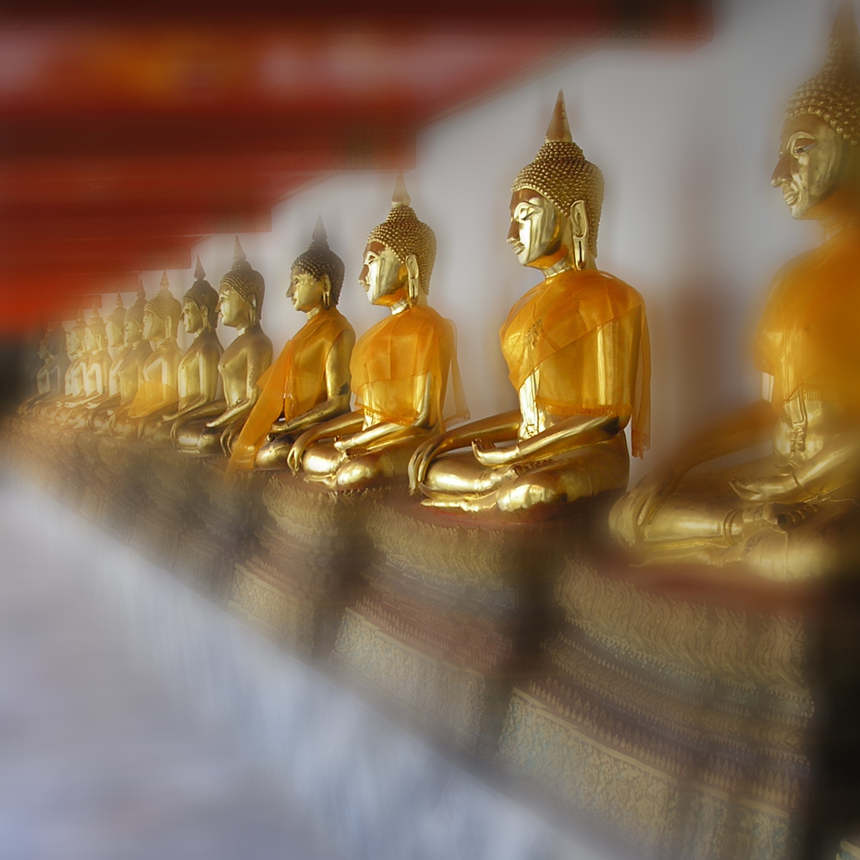Orange Buddha: Abstract artwork, printed on plexiglass. This captivating painting is distinguished by its vibrant and warm hues, creating a soothing atmosphere. The spiritual art of this painting depicts Buddhas symbolizing inner peace and balance, offering a touch of tranquility to your space.