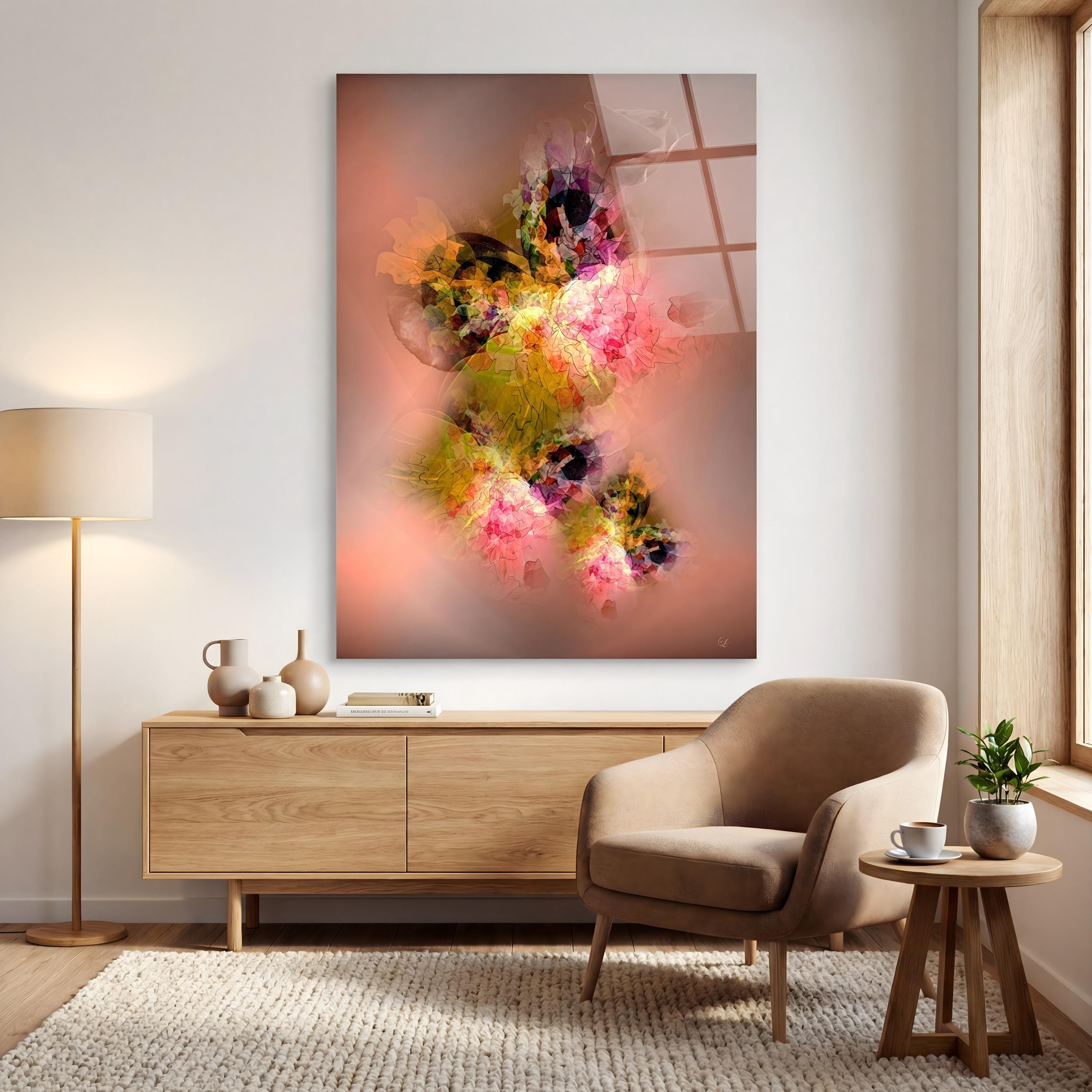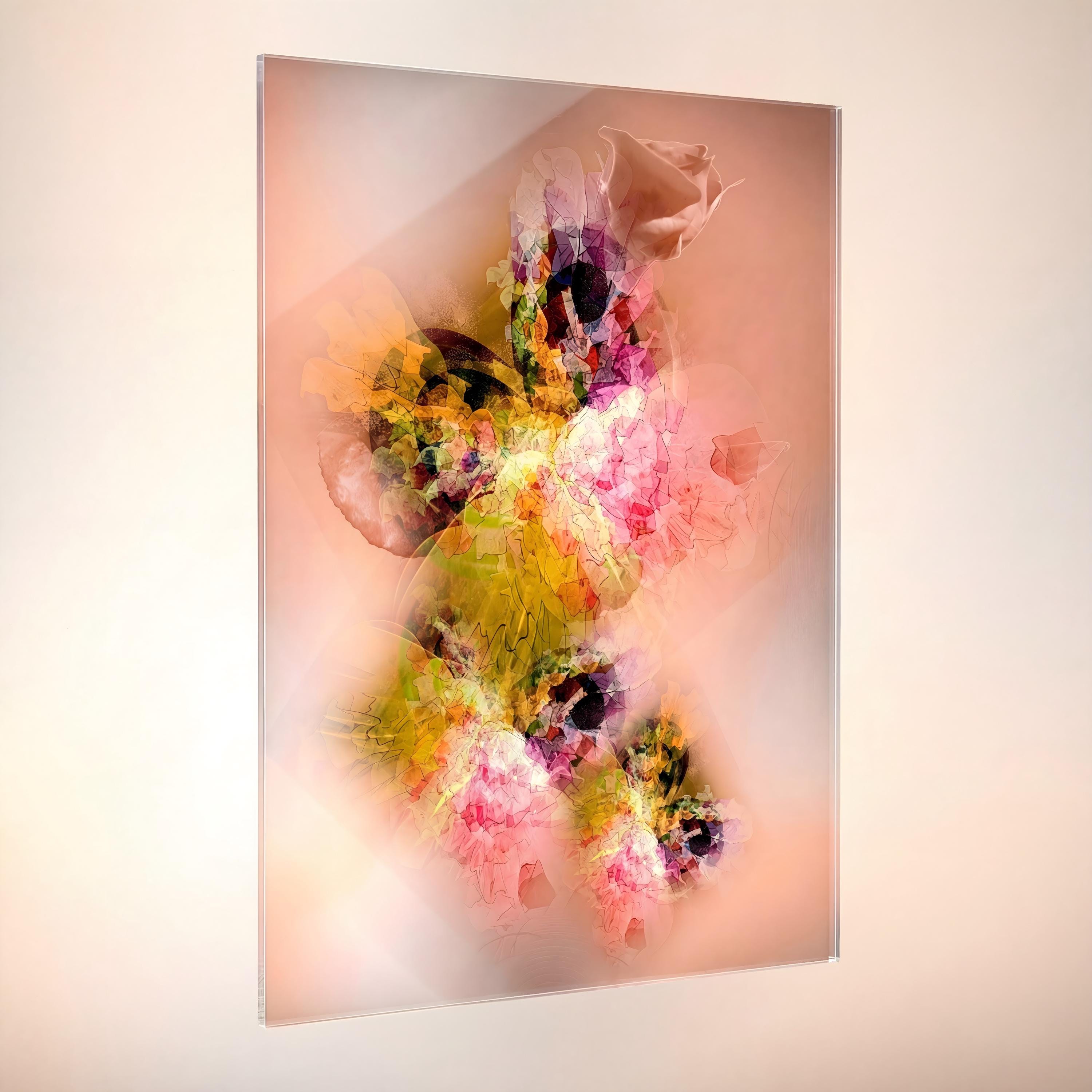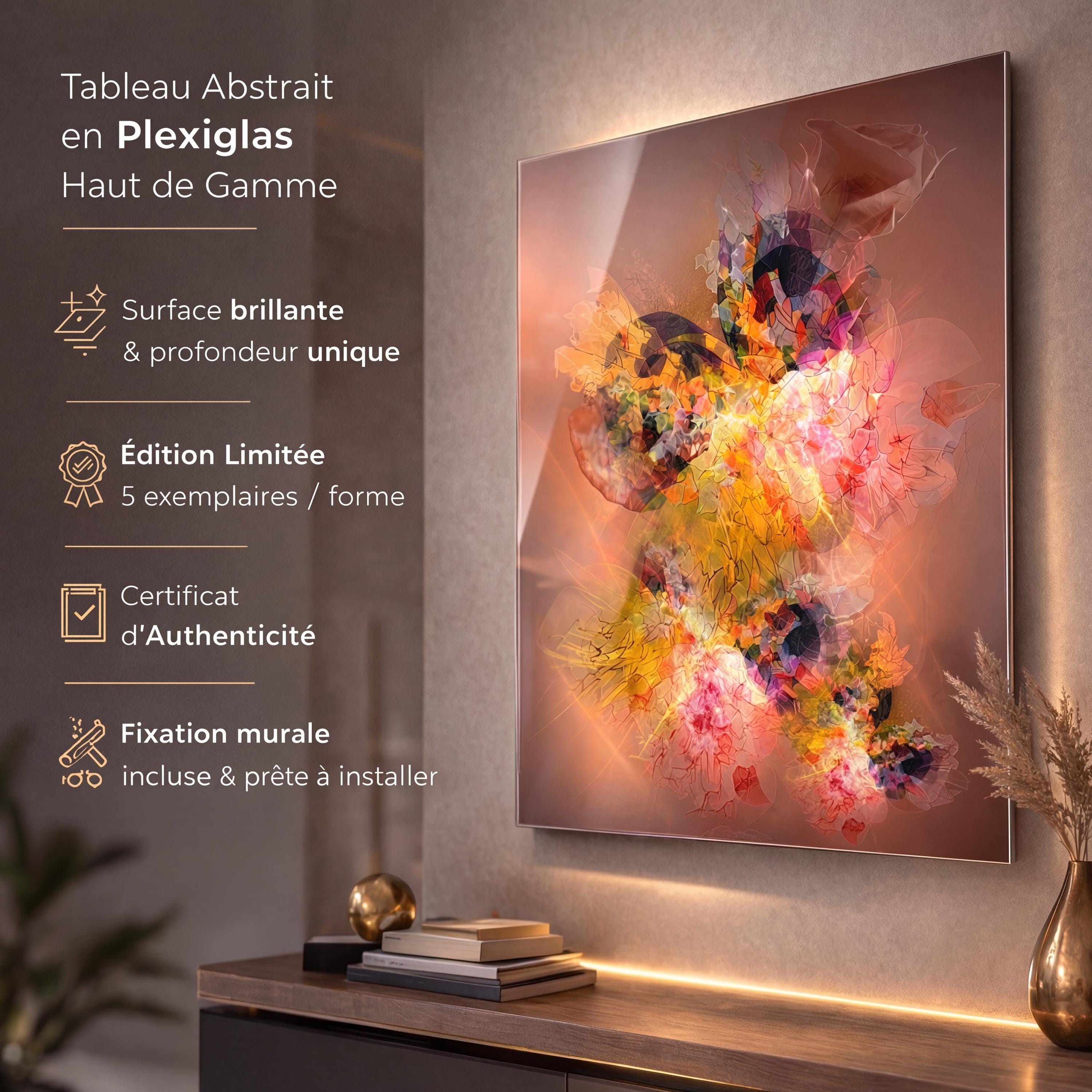 Une composition florale abstraite aux nuances vibrantes, sublimée par le plexiglas qui révèle toute la profondeur et la lumière de l’œuvre.