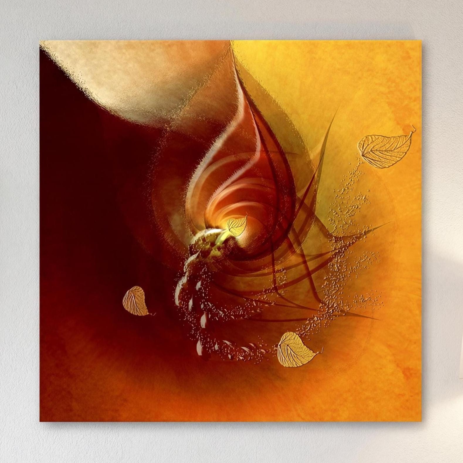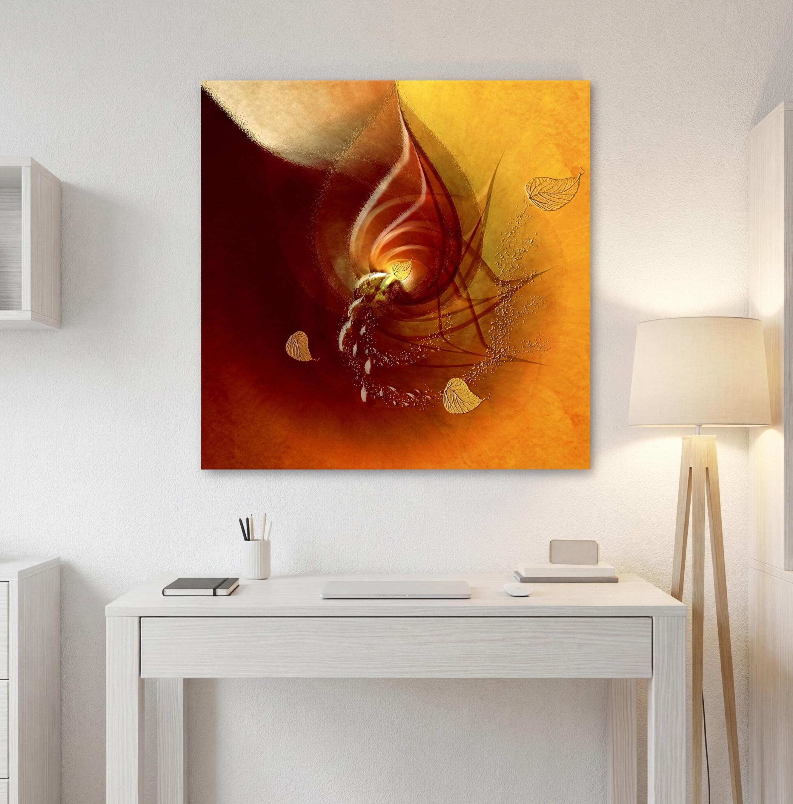 The warm, golden hues, combined with fluid abstract forms, create a luminous and expressive work. The gold leaf effect adds depth, visual relief, and elegance, while maintaining a modern and refined aesthetic.