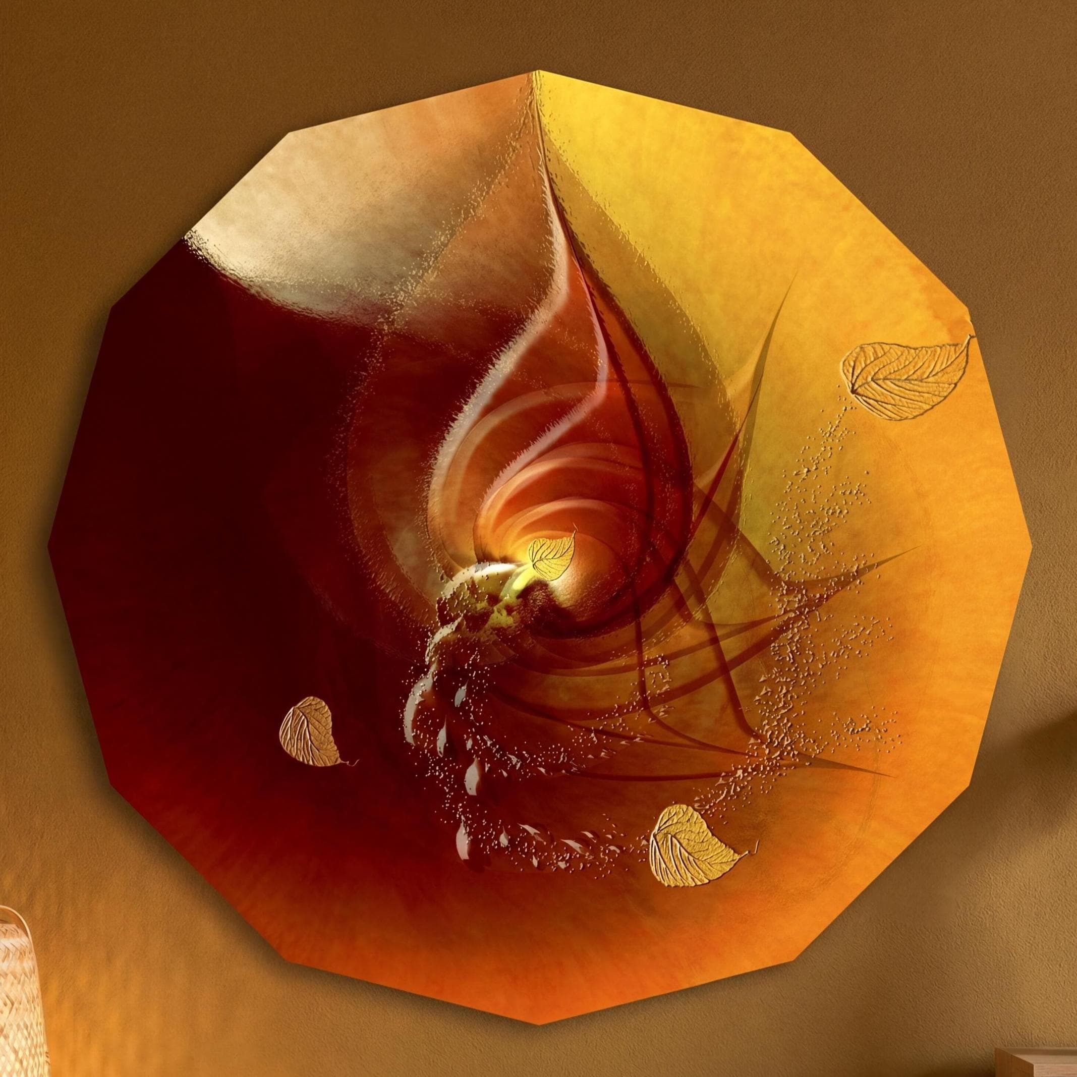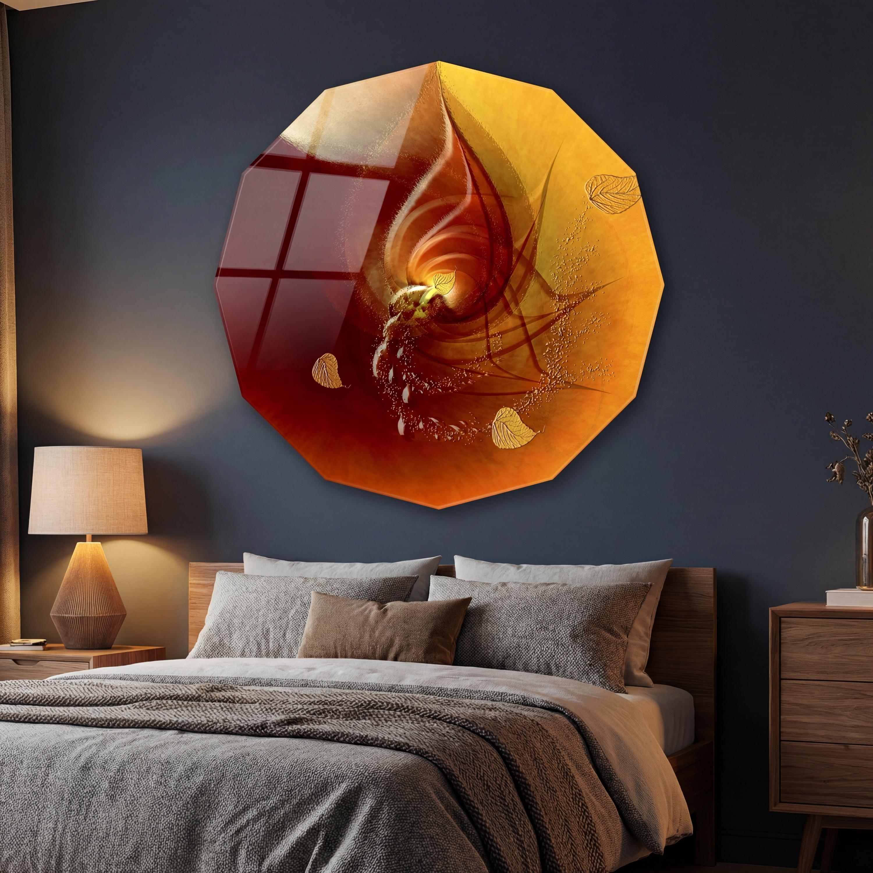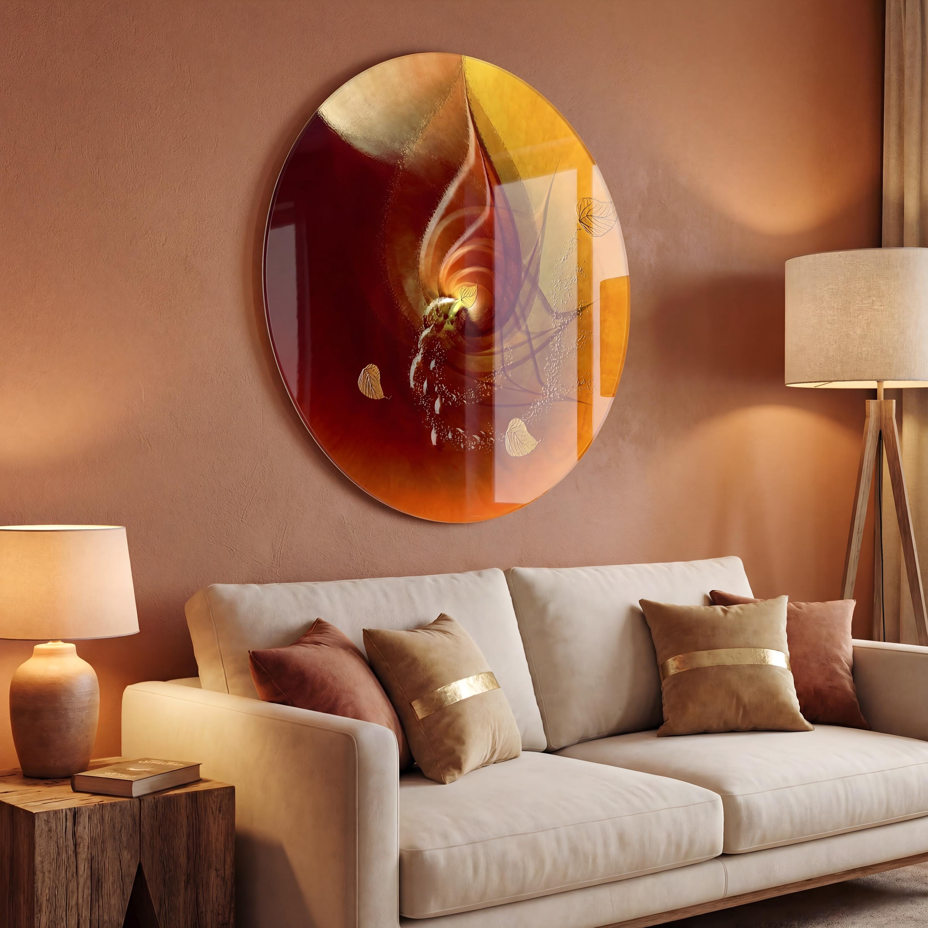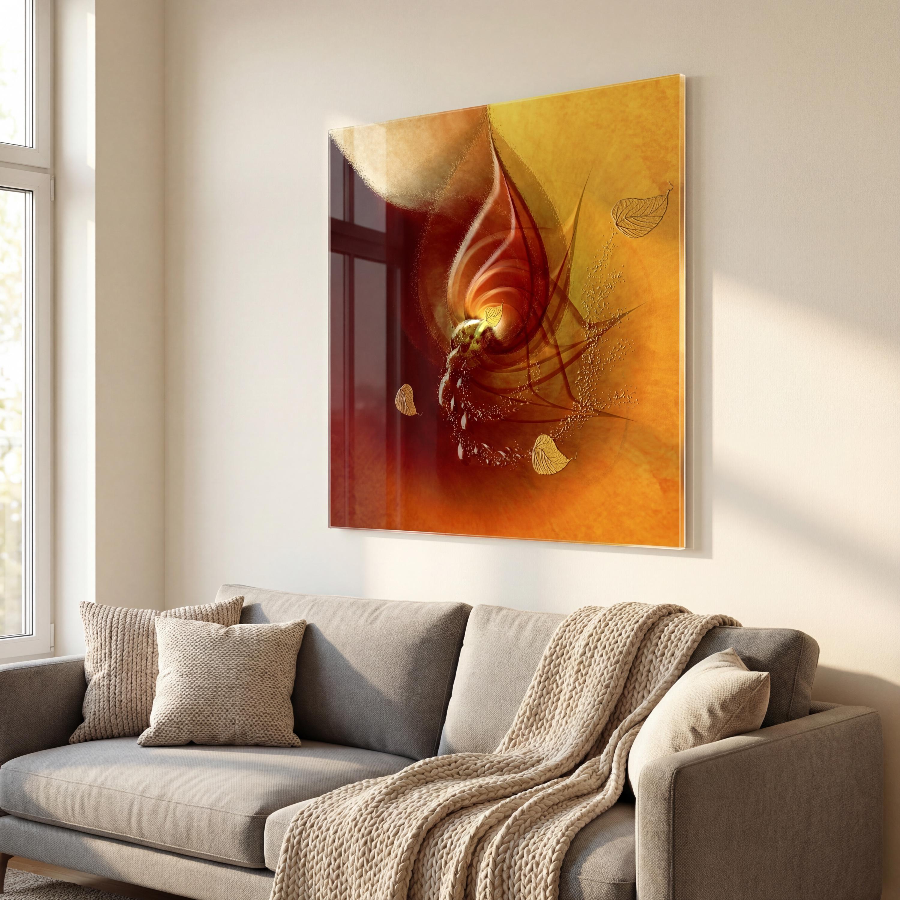 This high-end plexiglass wall art combines elegant red abstract art with a gold leaf effect to offer a luminous, deep and decidedly gallery-like finish.