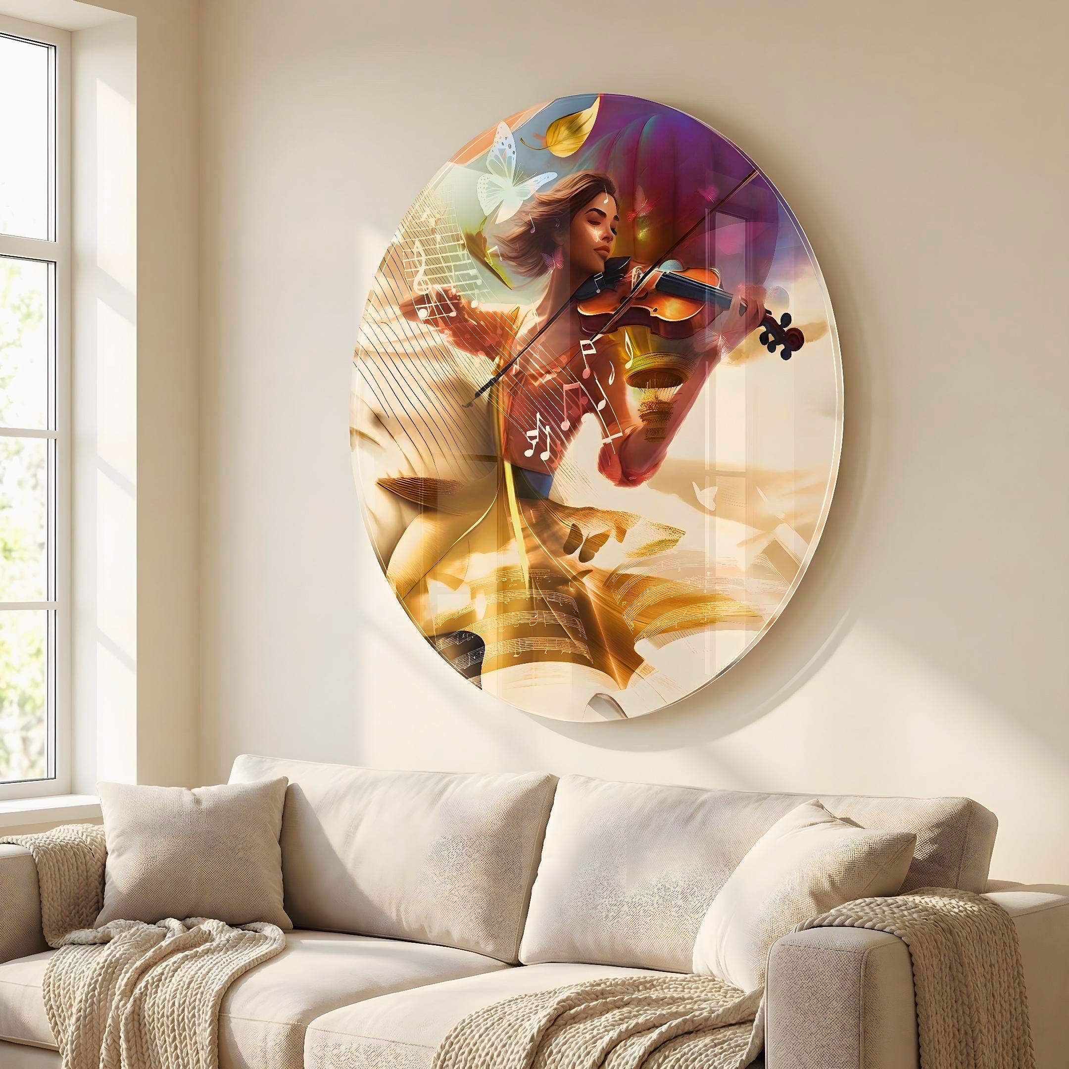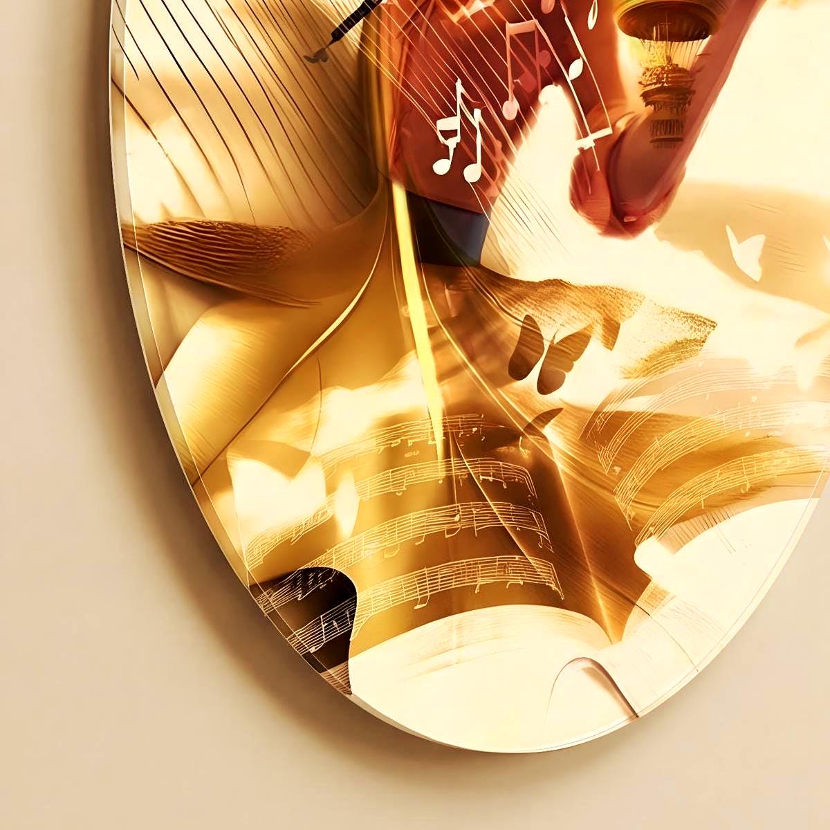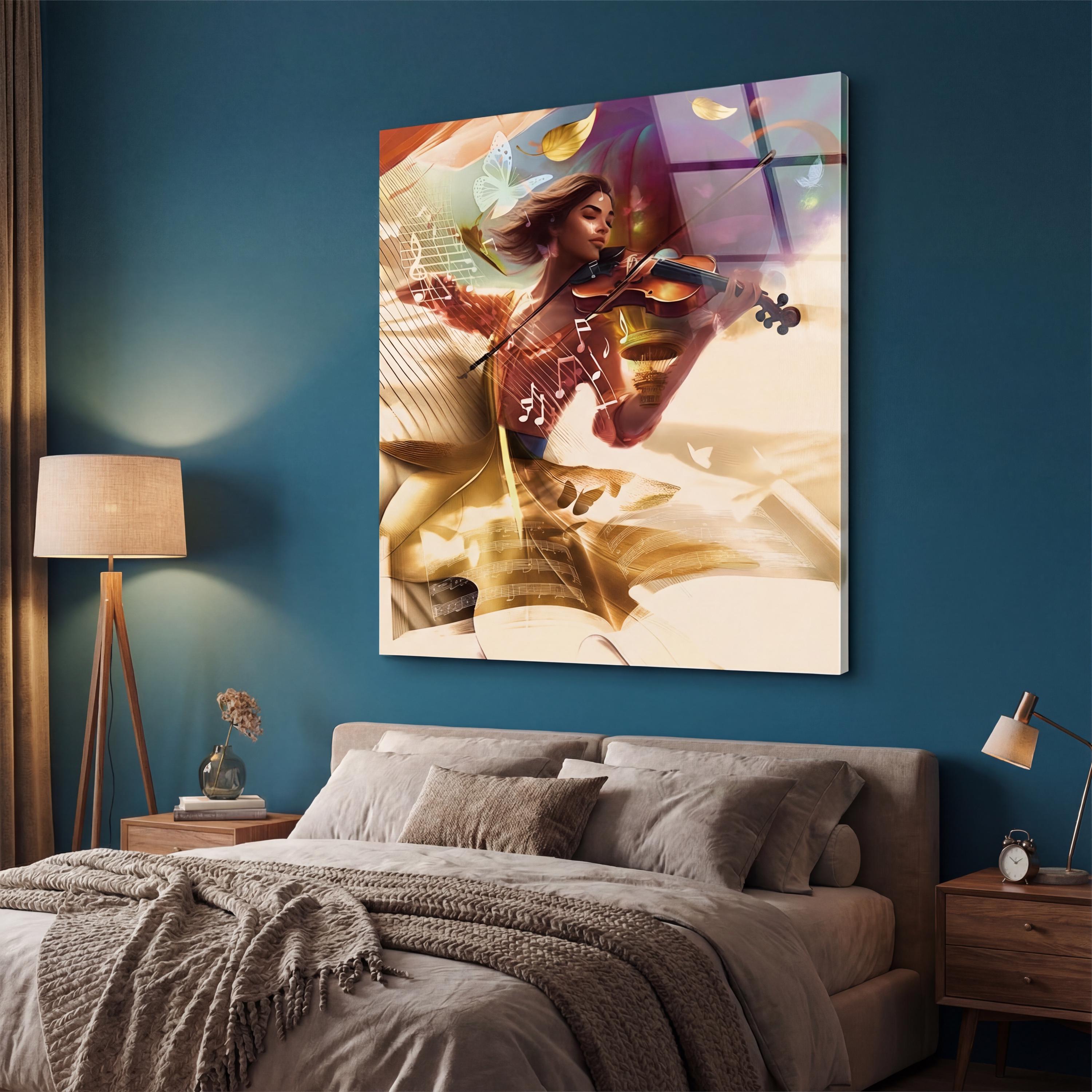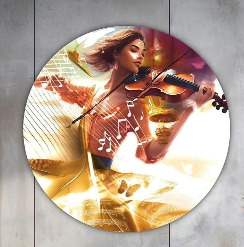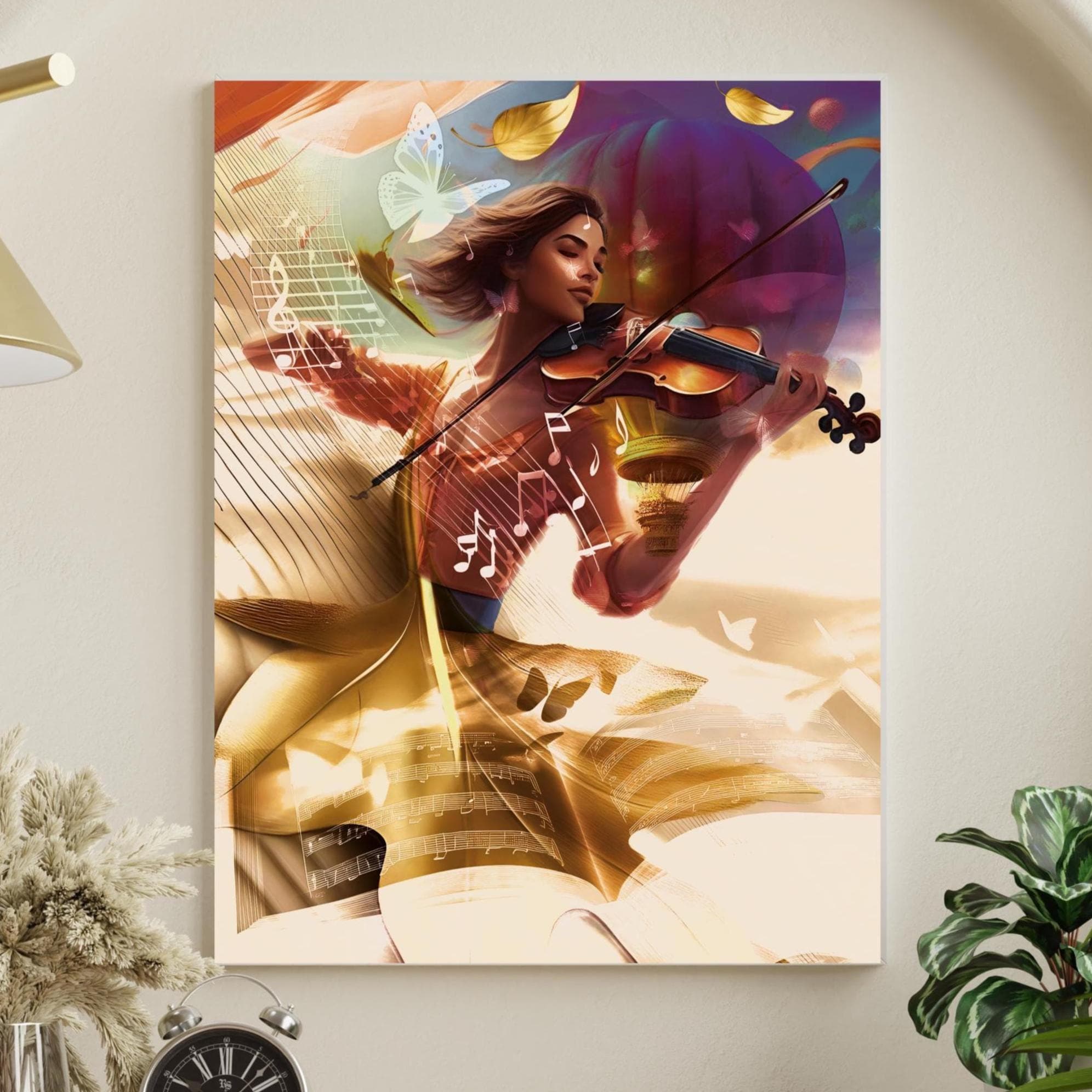 Mélodie Dorée est une œuvre abstraite contemporaine mettant en scène une musicienne stylisée, baignée de lumière et de mouvement.
