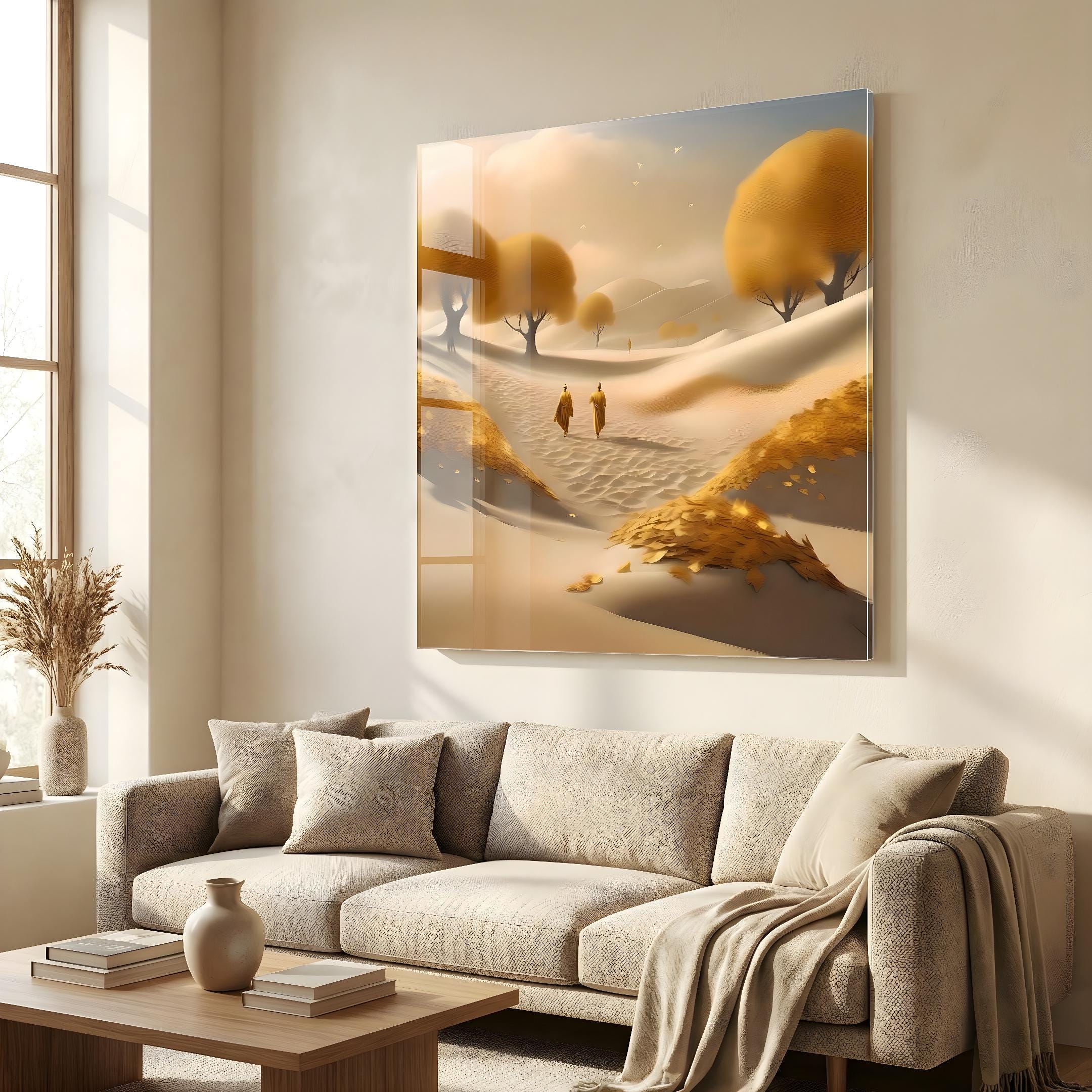 Moines Dorés dans le Sable d’Asie est une œuvre contemporaine inspirée de la spiritualité asiatique, mettant en scène deux figures dorées évoluant dans un paysage minéral lumineux et apaisant. La composition joue sur l’équilibre, la lumière et la profondeur visuelle, créant une atmosphère sereine et contemplative. Les nuances dorées apportent une présence élégante et chaleureuse à l’ensemble.