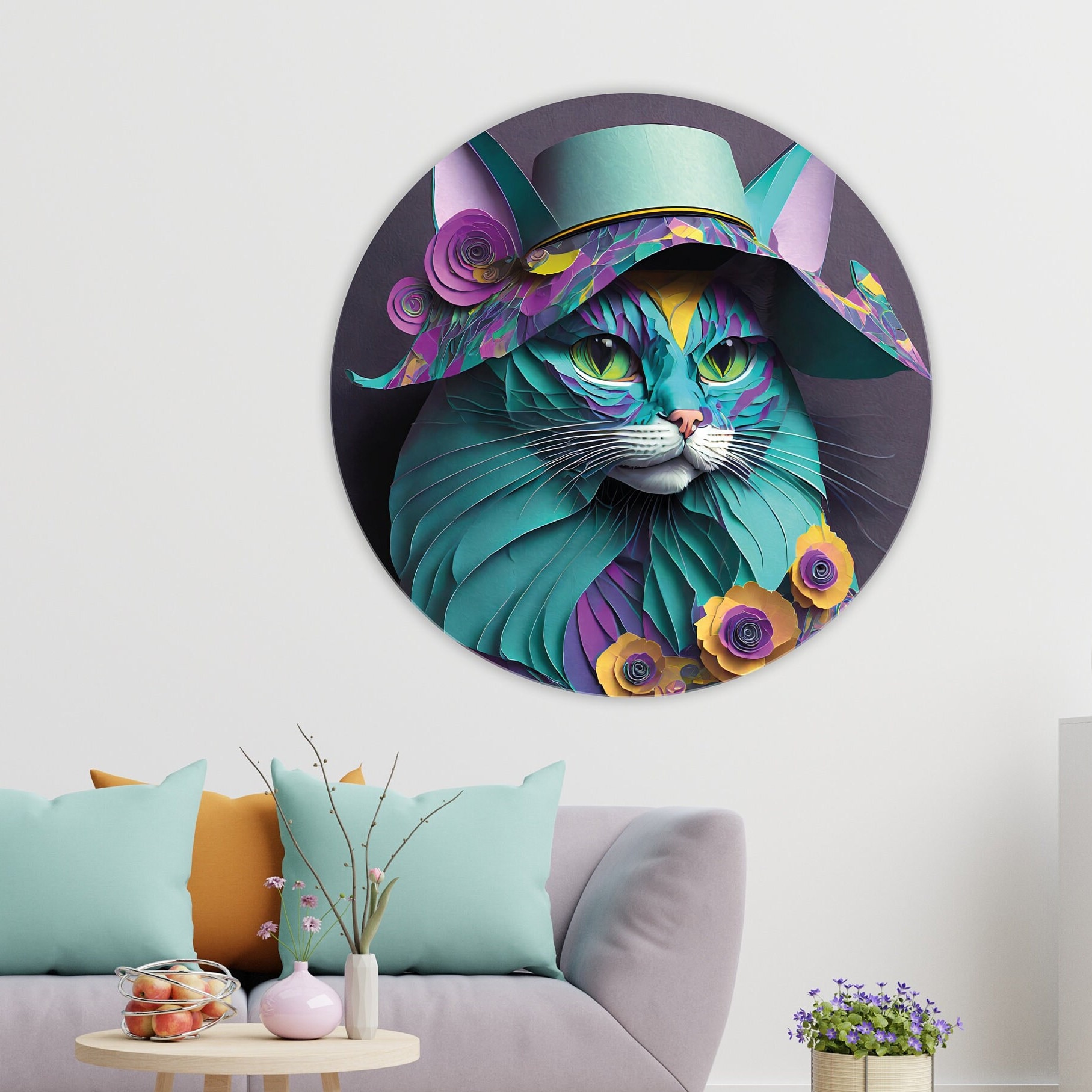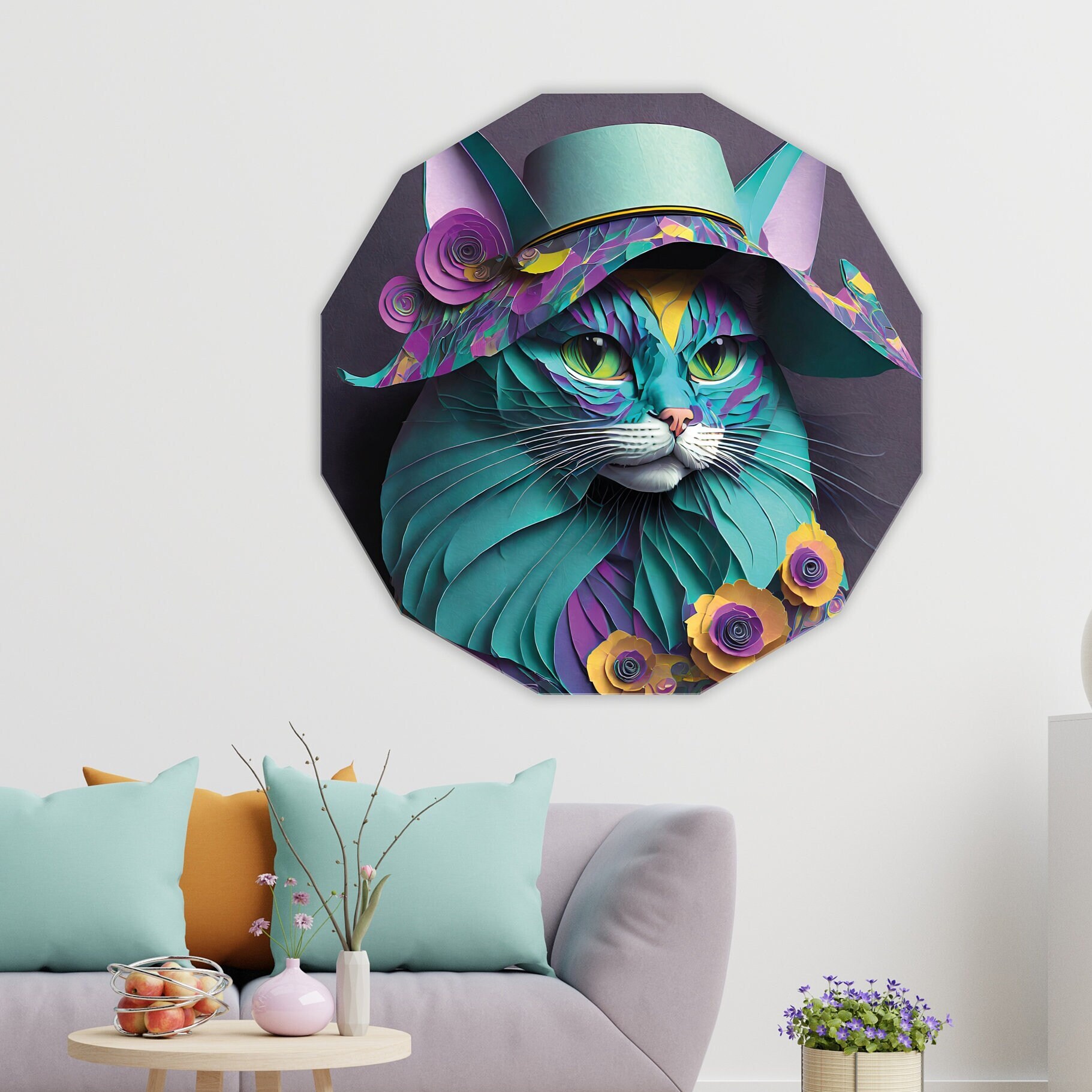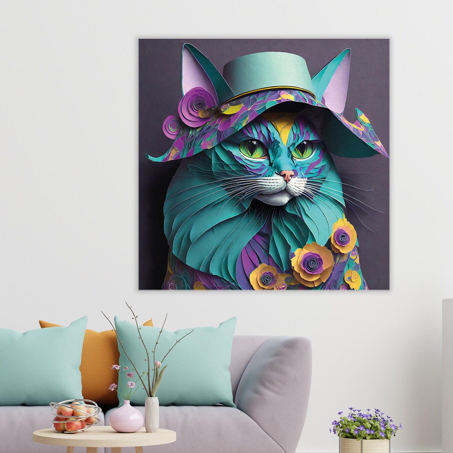 Children's bedroom decor - Cat poster for children - Modern decorative painting - Hat, flowers - Aluminum - Plexiglas - Living room wall art