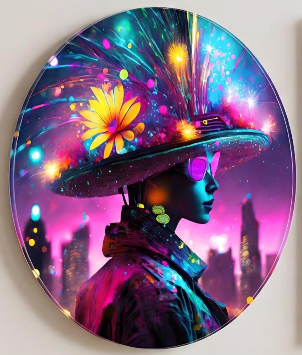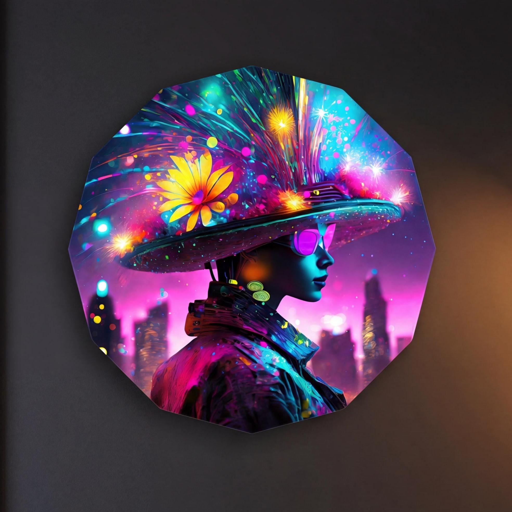 Cette œuvre contemporaine met en scène une silhouette futuriste baignée de lumières urbaines néon.
